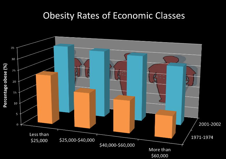 - More than 33% of adults who earn less than $15,000 a year are obese, while the rate is just 25% for those earning over $50,000 annually.
